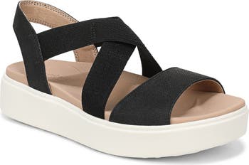 Elasticized straps offer a customized feel on a platform wedge sandal featuring Good Foam insole technology for less pressure on your feet and more bounce in your step.