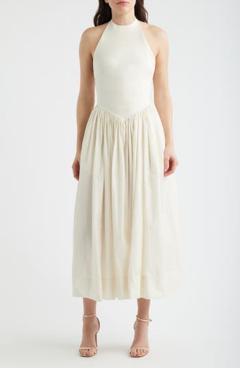 A pointed waist seam lends contemporary shape to this halter midi dress, made with a stretchy bodice and a crisp poplin skirt featuring on-seam pockets.