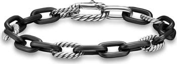 Ornately textured links alternate to a smooth contrast in this two-tone chain bracelet handmade from black titanium and sterling silver.