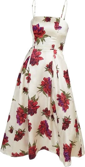 Madison Maison by Julie Harrah "You had me at corset dress with pockets. The Kelly Dress is the ultimate flattering full skirt. Thoughtful construction skims the waist with fifties-vibe volume without adding inches; but the corset back is the real game changer. The ties lace down from the top and end at the waist so you can decide the perfect size. The best part is it is slimming and holds you in without feeling constrictive. The Red Peony fabric is a beautiful Lightweight Silk Twill The model is wearing a size Small. Model is 5'11"" and is a size 0/2 and XSmall. Fabric: 100% Silk Twill