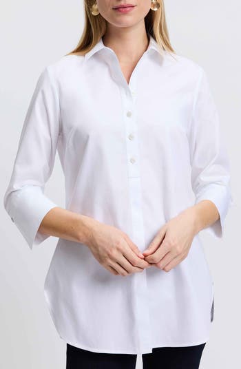 Classic cotton oxford cloth shrugs off wrinkles and distinguishes a popover shirt updated with three-quarter sleeves and an easygoing tunic length.