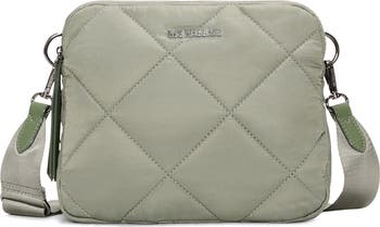 An adjustable webbing strap and a chunky handle provide versatile carrying options on this dual-compartment crossbody shaped from puffy, quilted nylon with rich leather trim.