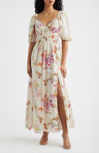A smocked bodice keeps you feeling comfortable as you move through your day in this puff-sleeve maxi dress made with sweetly ruffled details and lots of gathers.