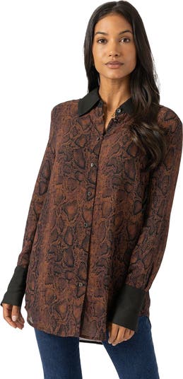 Buy the Madison Shirt . Our skilled artisans hand-make this oversized style using a semi-sheer georgette fabric decorated with a snake print and trimmed with gunmetal buttons. From our Women's Shirts here at Saint and Sofia
