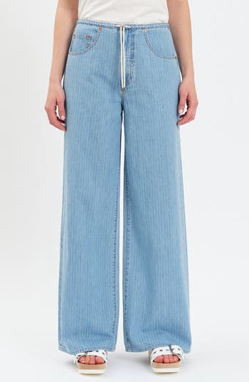 Polished stripes add a refined element to drawstring jeans cut from nonstretch denim in a wide-leg silhouette.