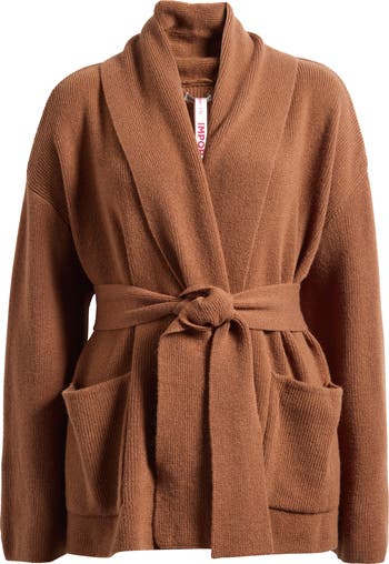 An exaggerated collar and sleeves add to the cozy vibe of this drapy cardigan made from pure wool fibers. An optional tie belt lets you cinch the perfect fit.