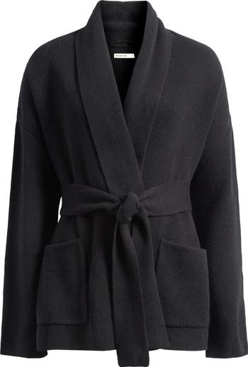 An exaggerated collar and sleeves add to the cozy vibe of this drapy cardigan made from pure wool fibers. An optional tie belt lets you cinch the perfect fit.