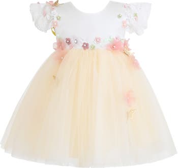 This enchanting dress is crafted for magical celebrations, blending delicate lace with airy tulle for a whimsical finish. The floral and butterfly appliqués add playful charm, making it a perfect choice for special occasions.