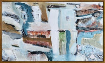 Strokes of colors come together in an assortment of washed-out hues to create this captivating abstract painting that adds a breath of fresh air to any space. A brass frame lends versatility to this painting, so it looks at home in any style of room.