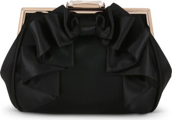 This stunning evening bag features the brand's signature ruffle pouch design and luxurious satin bow detailing. Its gold-tone hardware adds a touch of glamour, while the crystal clasp closure provides a secure and elegant finish.
