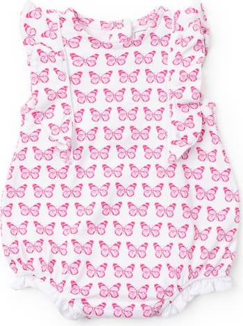 Girls' short sleeve bubble with piped seam at chest and ruffled neck. Snap closure in back and three snaps in the stride. Made from 100% Peruvian Cotton.