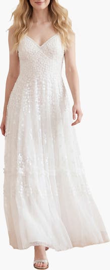 The Maeva Cami Ankle Gown reintroduces a signature Needle & Thread design, featuring floral sequin motifs on the bodice and trailing borders fading towards the hem. The high-shine sequins offer a lustrous finish. Developed with an elegant cami neckline, slim straps, and a softly gathered skirt tier with frothy ruffles, this gown exudes romantic charm. Layers of net and tulle create a voluminous skirt, finished with a sweeping hemline—a timeless piece to cherish.
