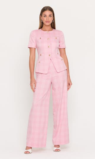 Make a polished statement in the Magda Windowpane Suiting Pants. Designed in a soft pink plaid with a fluid wide-leg silhouette, these tailored trousers bring a fresh, feminine twist to classic suiting. Wear them with the matching Reyes Jacket or Joselle Blazer for a fully coordinated look. Self: 65% Polyester, 33% Rayon, 2% Elastane Lining: 95% Polyester, 5% Elastane Professional Dry Clean Relaxed Fit Length: 44 1/4", Inseam: 32" Back Zipper Model Size & FitModel wears: US 2/XS / UK 6 / EU 34 Model's height: 5'10″ / 178cm