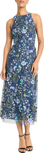 A gorgeous garden grows across a party-perfect dress cut from illusion lace in a summery, halter-neck silhouette.