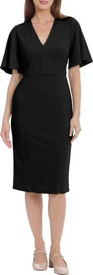 Flared flutter sleeves frame the bustier-inspired bodice of a stretch-enhanced midi dress topped with a polished V-neck.