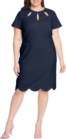 Airy cutouts top this figure-skimming frock crafted with easy-moving stretch and a sweet scalloped hem.