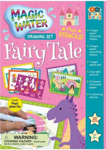 MAGIC WATER DRAWING SET: FAIRY TALE - Step into a world of imagination and magic with the Buddy & Barney Magic Water Drawing Set – Fairy Tale Edition! This enchanting art kit lets children explore their creativity by revealing beautiful princesses, fairies, castles, and magical creatures using only water. Simply fill the included magic water pen, glide it across the special reusable pages, and watch as vibrant, hidden images appear like magic. Once dry, the artwork disappears, ready to be created all over again for endless artistic fun. The set also includes two durable stencil sheets and coloring pencils, allowing children to trace, design, and decorate their very own fairy tale scenes. This activity encourages creative expression, fine motor skills, and imaginative storytelling, making it perfect for girls who love magical worlds. Designed with child-safe, non-toxic materials, this mess-free art kit ensures a safe and stress-free experience for parents and hours of fun for kids. Its reusable and portable design makes it an ideal choice for home play, travel, holidays, and quiet-time entertainment. Whether as a birthday present, holiday gift, or creative surprise, this fairy tale water drawing set is perfect for young artists and dreamers who love princesses, fairies, and magical adventures. INCLUDES: 2 Magic Coloring Sheets, 3 Water Stencils, 1 Water Pen, 2 Stencils, 10 Sheets of Paper, and 4 Coloring Pencils.