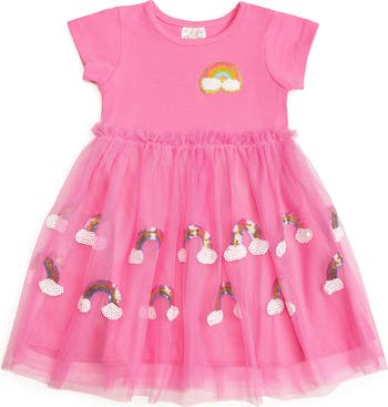 - Features: Color: Raspberry pink cotton bodice accented with a rainbow chenille patch and a pink tulle skirt overlay accented with multicolor sequin rainbows.