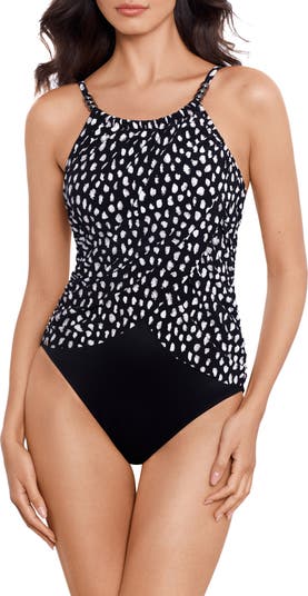 An eye-catching print and a draped tulip front charm this one-piece swimsuit featuring a body-control design for comfortable slimming and shaping.