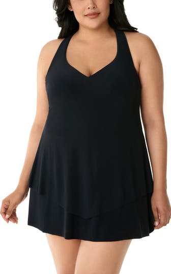 A racerback design adds extra support to a sleek, slimming tankini top completed with a flattering angled hemline.