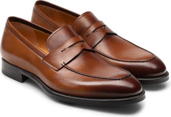 A geometric penny keeper and slim apron toe highlight the burnished leather upper of a sharp loafer furnished with a cushioned insole and built-in arch support for underfoot comfort.
