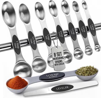 Magnetic Measuring Spoon Set with dual‑sided design, easy‑read US & metric markings, durable stainless steel, and compact nesting for secure storage.