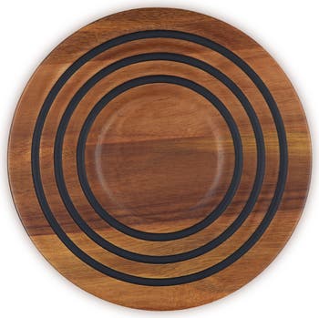 Serve an elegant dish, while protecting surfaces from heat, with this beautiful 8-inch trivet made from acacia wood. It is deisgned with a magnet that instantly attaches to the bottom of metal cookware for easy serving from oven to table, and features three silicone rings on the top to provide a heat-resistant cushioned base.