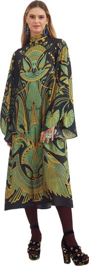 The Magnifico Dress you all know and stun in, but cut with a shorter midi hemline to bring more opulence to your day-to-night wardrobe. Like its sister it features a stand-up collar, long sash at the back and draped waterfall sleeves, and is cut in our luscious silk twill which has a subtle weave and sheen. Inspired by J.J.’s journeys through Egypt, this Nile motif is made all the more captivating, printed by hand to fall perfectly every time. Do as she does and reverse it for an equally beguiling look!