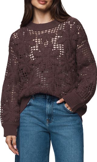 Airy open stitching and appliquéd flowers give a free-spirited feeling to this oversized and slouchy crewneck sweater.