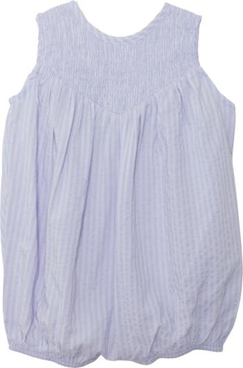 This romper features a lightweight, striped seer-sucker fabric with a smocked bodice and sleevelss design for a comfortable fit. Designed with a loose bubble silhouette, it?s perfect for easy dressing and warm-weather outings. Fabric Care & Content Machine Wash Cold | Line Dry | Do Not Bleach 65% Cotton 35% Polyester Lining: 100% Polyester