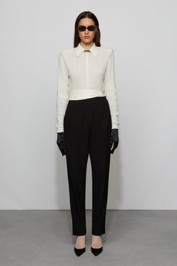 Tuxedo-inspired pant with an ivory cummerbund waistband and side stripes for tailored contrast. Features luxe combo textures, menswear detailing, and a sharp, flattering cut.