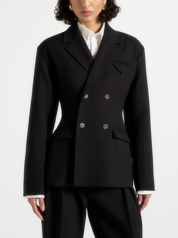 Crafted from tailored fabric for a classic look, this blazer combines structured tailoring with refined detailing. The double-breasted silhouette and sharp lapel create a timeless shape, while a cinched waist and darted body define and sculpt the fit. Marble feature buttons elevate the design with subtle contrast, complemented by functional front and angular welt pockets for a precise, tailored finish. Completed with smooth satin lining, this piece offers all-day comfort beneath its sculpted structure.