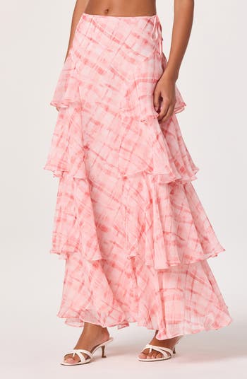 Tiered ruffles in sun-washed plaid cascades through this breezy maxi skirt that brings romantic movement to a vacation-ready silhouette.