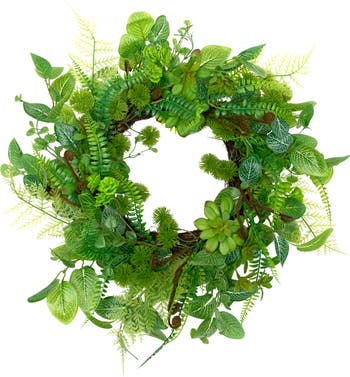 Add bright pops of color and a touch of nature to your home with our artificial, fern foliage wreath. Featuring various green shades of assorted artificial plant life intertwined with a natural grapevine base, it provides a full and luscious look. What better way to welcome guests and spring to your home than with this life-like wreath. Features: Maidenhair fern leaves and foliage wreath Designed with assorted leaves in varying shades of green Natural twig grapevine backing for hanging Recommended for indoor use only, or covered outdoor use No assembly required - wreath comes in 1 piece Dimensions: 24" diameter (measured from outermost edge to outermost edge across the wreath) Material(s): polyester/twig/wire/plastic