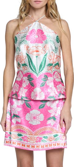A floral-dot print and sleek halter neckline give this satin top flirty elegance that moves effortlessly from daytime plans to evening cocktails.