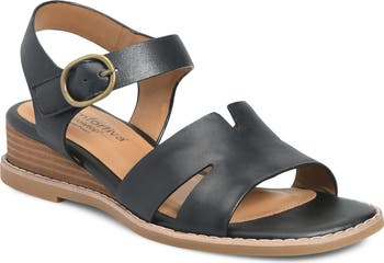 Geometric cutouts bring subtle dimension to a two-piece leather sandal set on stacked wedge heel. Memory foam cushioning and a grippy sole deliver underfoot comfort and stability.