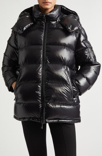 This warm down-filled puffer jacket is fashioned from glossy lacquered nylon and fitted with an inner stand collar and removable drawcord-toggle hood with a snap front to ward off the chill.