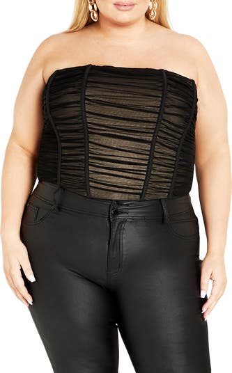 Rippled ruching romances this gauzy mesh corset top meant to show off your shoulders.