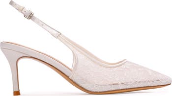 - Pointy toe slingback lace pump with embellished buckle detail, set on a curved mid heel