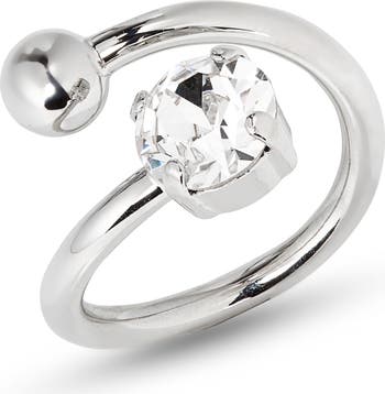 From a French designer influenced by punk and glam rock comes this edgy, open ring set with a shining sphere and a twinkling crystal.