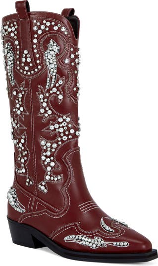 An assortment of crystals glamorously accentuate the decorative stitching of this Western boot balanced by an almond toe and chunky heel.
