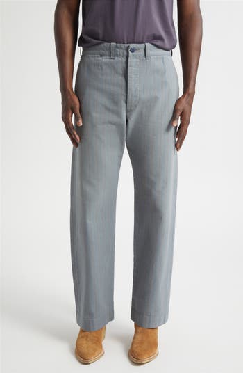 Faded pinstripes emphasize the relaxed look and feel of chinos tailored from a blend of cotton and linen that's brushed for softness and designed for comfort. They sit right at the hips and stay roomy through the seat and down the legs, with flat-front construction keeping the styling effortlessly timeless.
