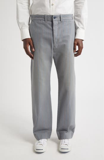Faded pinstripes emphasize the relaxed look and feel of chinos tailored from a blend of cotton and linen that's brushed for softness and designed for comfort. They sit right at the hips and stay roomy through the seat and down the legs, with flat-front construction keeping the styling effortlessly timeless.