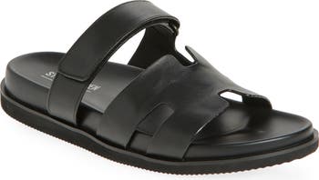 Geometric cutouts enhance the modern dimension on a casual slide sandal designed with an adjustable instep strap for a customized and secure fit.