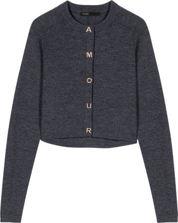Metropolitan energy infuses the collection, where refined details and an assertive attitude create a new kind of femininity.This short cardigan stands out with its raglan sleeves and fitted shape, accentuated by five rose gold-tone metal buttons that spell out the word AMOUR.Layer it over a white shirt and pair it with wide-leg tailored trousers to play on the contrast between tailoring and modernity, adding a pop of colour with a sweater tied at the waist and suede loafers.