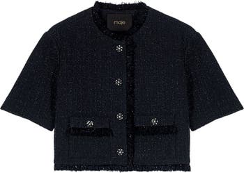 The new season takes on a sophisticated, metropolitan feel with elaborate pieces in textured materials and bold cuts. This short jacket in black bouclé tweed is captivating with its graphic silhouette, textured feel and the subtle sparkle of its rhinestone jewel buttons. The fringed trim highlights its confident modernity, while the flap pockets and straight cut structure the piece for a resolutely chic look. Mix and match with black high-waisted trousers, a gold chain belt and a fringed bag to create a strong, contemporary silhouette.