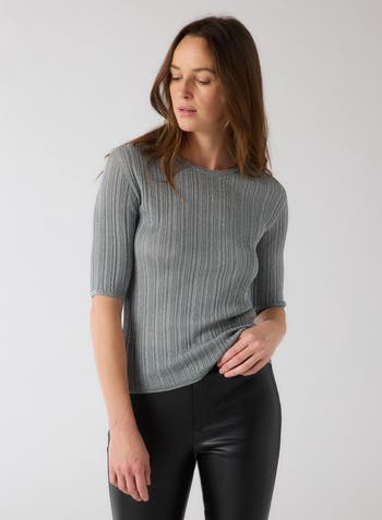 A fresh take on a classic silhouette, this elbow sleeve crewneck features a subtle metallic rib texture that adds dimension and shimmer. Designed with a flattering fit and soft stretch, it effortlessly balances comfort and elevated style—perfect for day-to-night wear.