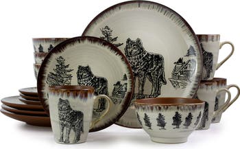 Add a beautiful accent to your dining table with the Elama Majestic Wolf 16 Piece Round Stoneware Dinnerware Set in Taupe. This complete dish set is creatively crafted into unique and contemporary shapes and beautifully colored in light and dark wooden brown and black forest accents. Each plate is microwave safe for easy heating and dishwasher safe for easy cleaning.