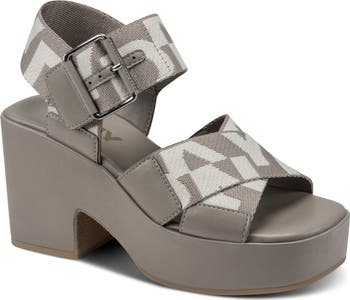 - Adjustable ankle strap with buckle closure; hidden elastic inset