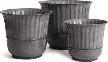 Made of a durable metal, glazed and baked at 300 degrees, so they are able to withstand the elements in the extreme. With a dynamic, antiqued enamel-like coating. Perfect for well, the Terrace! Pots measure 14.25 x 14.25 x 12 ; 12 x 12 x 10.5 ; 10 x 10 x 8.5 x